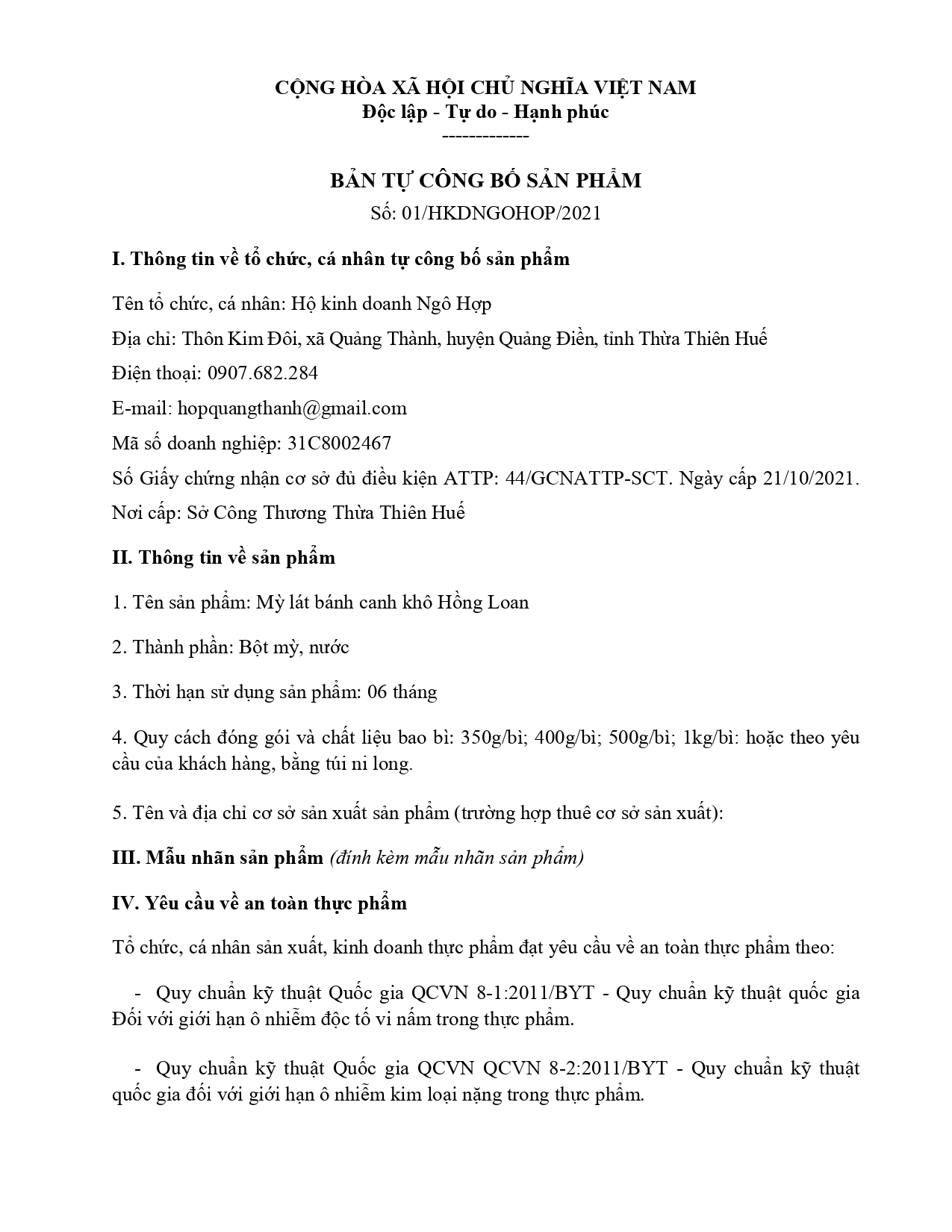 + Công bố sản phẩm: 01/NGOHOP/2021