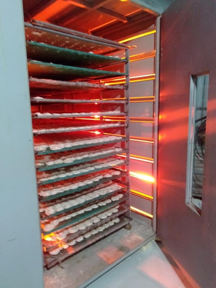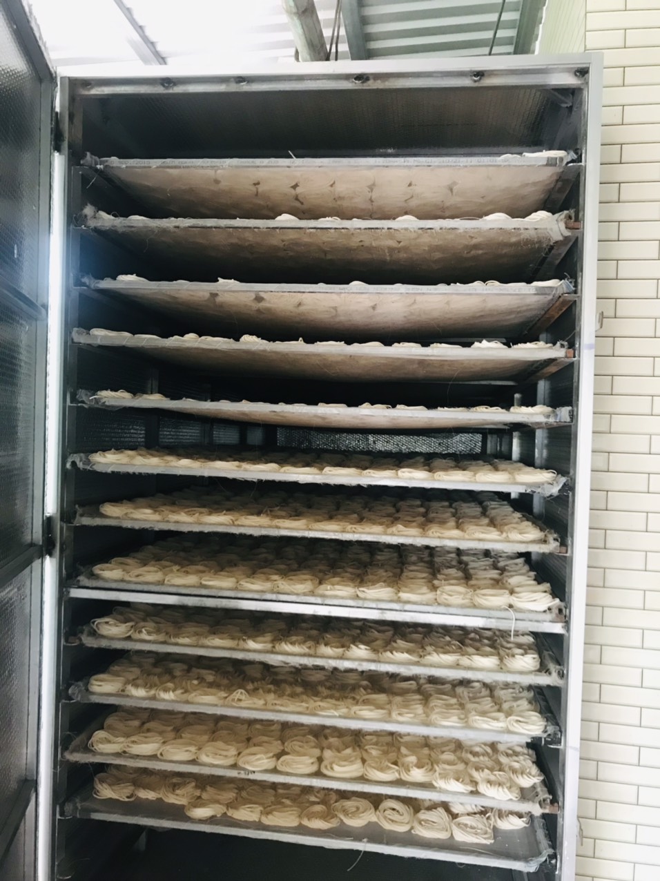Mỳ vắt sau khi tạo hình sẽ mang đi sấy khô ở nhiệt độ 450C Trong khoảng thời gian 8h quá trình sấy khô trong phòng kín đảm bảo vệ sinh an toàn thực phẩm.