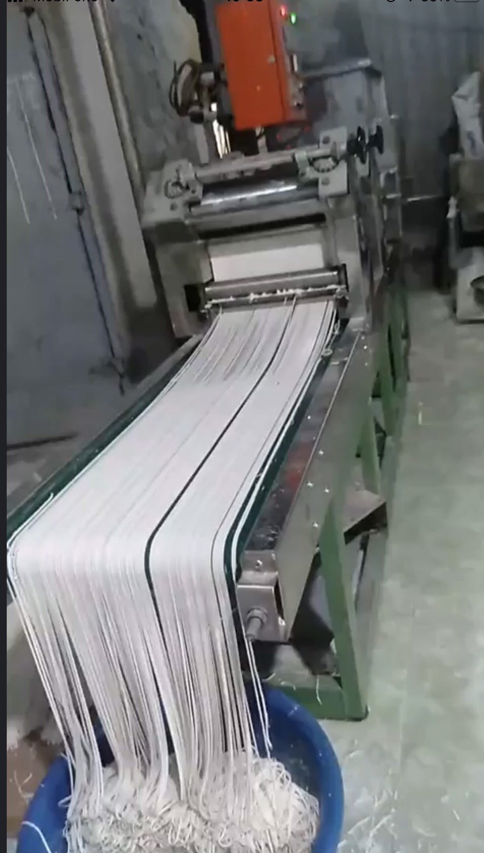 Bột mỳ đã nhào trộn cho vào máy cán liên hợp cán thành tấm mỏng, khối bột sau khi nhào trộn cán mỏng được cho qua trục hình trụ tròn có rãnh khe nhỏ đường kính thường từ 3-5 mm, sau đó sử dụng lực ép để ép thành sợi dài để cắt thành sợi